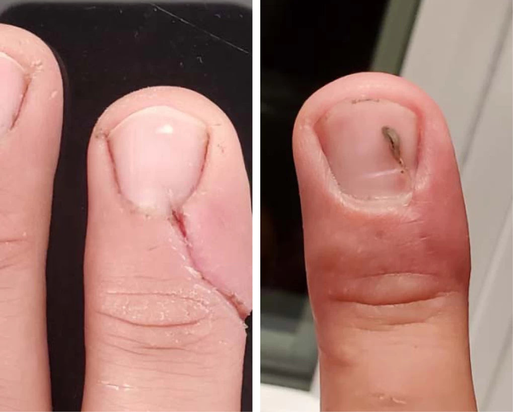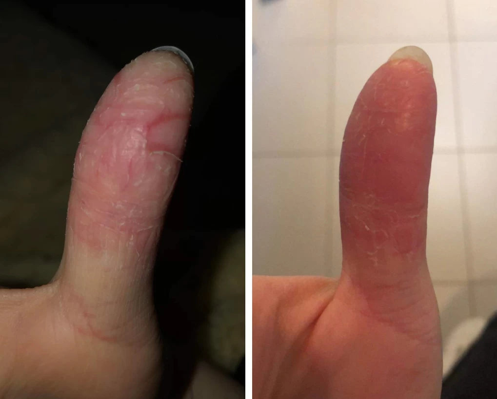 Le doigt coupé d'un menuisier. La coupure était si profonde qu'il aurait dû idéalement, aller à la clinique se faire mettre des points de rapprochement. On a donc décidé d'utiliser le Derma Collagen pour la régénération et la cicatrisation. Résultat spectaculaire !