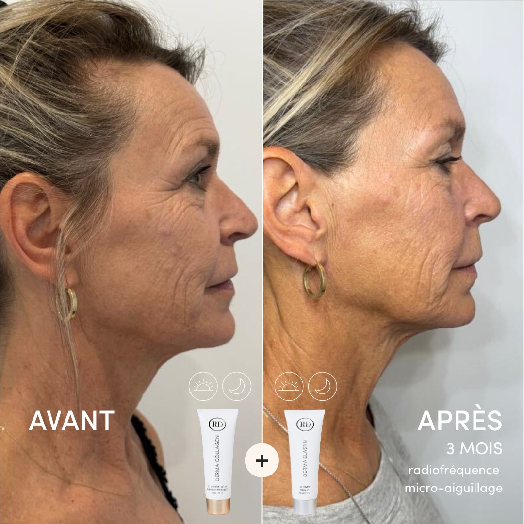 Application: Derma Collagen et Derma Elastin matin et soir pendant 3 mois.